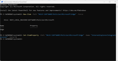 Set-ItemProperty -Path "HKLM:\SOFTWARE\Policies\Microsoft\Edge" -Name "InternetExplorerIntegrationLevel" -Value 1